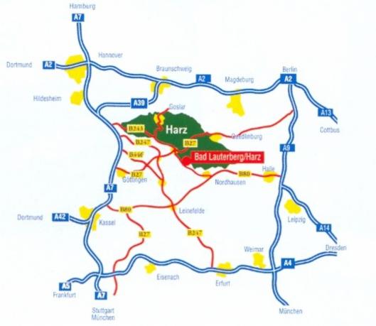 .... und so finden Sie uns: A7 Hannover - Kassel: Ausfahrt Seesen, B 243 Osterode - Herzberg - Bad Lauterberg A7 Kassel - Hannover: Ausfahrt Göttingen-Nord, B 27 Richtung Braunlage nach Bad Lauterberg Halle bzw. Erfurt: A 38 Richtung Nordhausen, B 243 nach Bad Lauterberg |